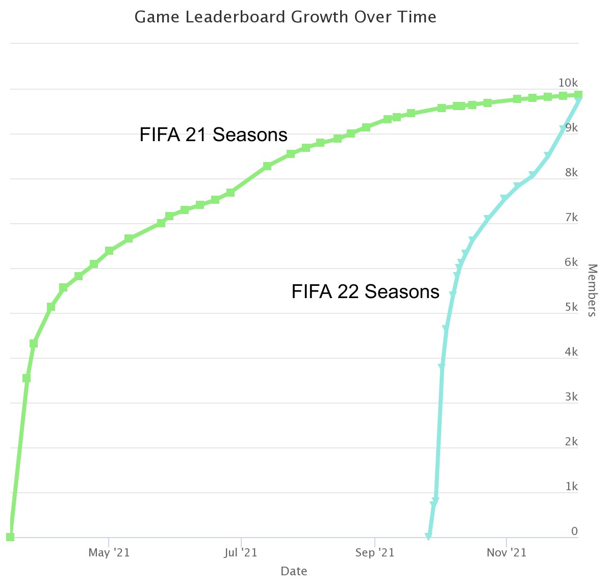 Check out the FIFA 22 and FIFA 21 Seasons leaderboards over time. (note: this is unfortunately not quit an apples to apples comparison due to slightly different criteria for getting on the leaderboard)